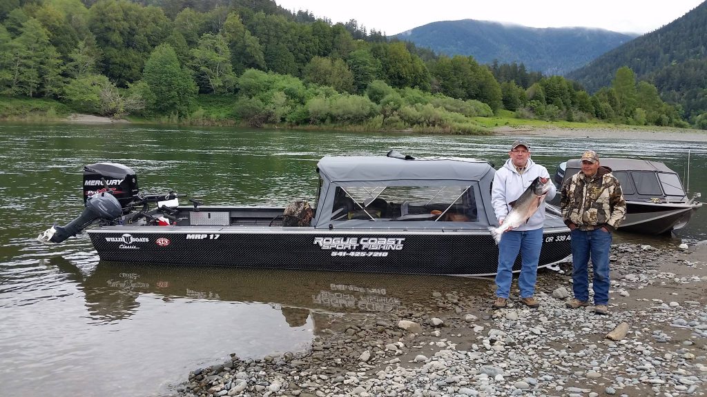 For fishing the Rogue River from tidewater to Blossom Bar, we use a super custom 25 foot Willie Boats open sled. Heated and covered for steelhead and Spring Salmon, you can fish four guests, plenty of gear, and still have room for comfort.
